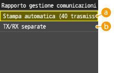 Selezionare <On> per stampare separatamente i rapporti di invio e ricezione o <Off> per stampare entrambi i rapporti su un solo foglio.