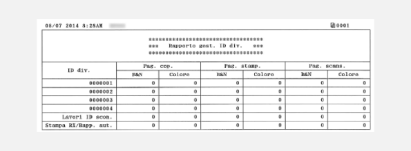 Se Gestione ID reparto è abilitata, è possibile controllare il volume totale delle stampe per ciascun <ID divisione> stampando un Rapporto gestione ID reparto. Controllando i totali di stampa, è possibile meglio gestire i materiali di consumo come carta e toner.