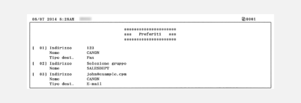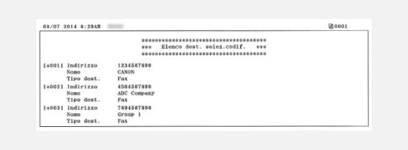 È possibile controllare l'elenco delle destinazioni registrate nella Rubrica come <Selezione codificata>, <Preferiti> e <Selezione gruppo> stampando un Elenco rubrica.