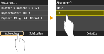 Tippen Sie auf dem Bildschirm, der beim Kopieren angezeigt wird, auf <Abbrechen>