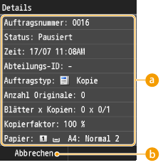 Die Anzahl an Kopien, die Einstellungen und weitere Details werden angezeigt. Wenn Sie nur die Details prüfen möchten, ohne das Kopieren abzubrechen, drücken Sie