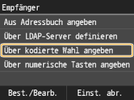 Im Adressbuch können Sie einen Empfänger aus der Liste der gespeicherten Empfänger auswählen oder unter den Empfängern, für die ein Name gespeichert ist, nach einem Namen suchen. Außerdem können Sie einen Empfänger direkt über die dem Empfänger zugewiesene dreistellige Nummer (Nummer für die kodierte Wahl) angeben.
