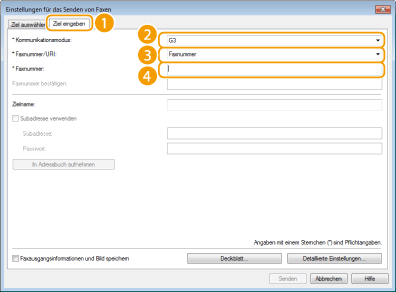 Wenn Sie in dem Dialogfeld, das angezeigt wird, wenn Sie auf der Registerkarte [Spezial] auf [Sicherheitseinstellungen] klicken, die Option [Faxnummer/URI bei Einstellen des Ziels bestätigen] gewählt haben, geben Sie [Faxnummer bestätigen]/[URI bestätigen] ein. Wenn Sie weitere Informationen benötigen, klicken Sie auf dem Faxtreiberbildschirm auf [Hilfe].