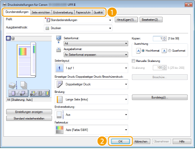 Ändern Sie die Einstellungen auf dem Druckeinstellbildschirm, und klicken Sie auf [OK].