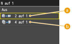 Sie können zwei oder vier Bilder auf ein einziges Blatt drucken. Tippen Sie auf <2 auf1> oder <4 auf1>.