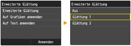 Die Einstellungen für <Auf Grafiken anwenden> und <Auf Text anwenden> auf dem Display sind nur wirksam, wenn im Druckertreiber für Erweiterte Glättung die Option [Druckerstandard] festgelegt wird.