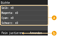 Feineinstellung der einzelnen Druckdichten für <Gelb>, <Magenta>, <Cyan> und <Schwarz>.