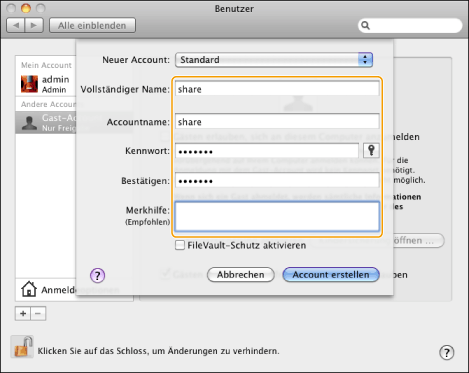 geben Sie in [Kennwort] das Passwort ein geben Sie in [Kennwort bestätigen] das Passwort erneut ein klicken Sie auf [Erstellen].![]() Geben Sie einen Benutzernamen mit maximal 20 alphanumerischen Zeichen und ein Passwort mit maximal 32 alphanumerischen Zeichen ein.