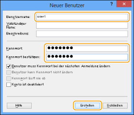 geben Sie in [Kennwort] das Passwort ein geben Sie in [Kennwort bestätigen] das Passwort erneut ein klicken Sie auf [Erstellen].![]() Legen Sie einen Benutzernamen mit maximal 20 alphanumerischen Zeichen und ein Passwort mit maximal 32 alphanumerischen Zeichen fest.