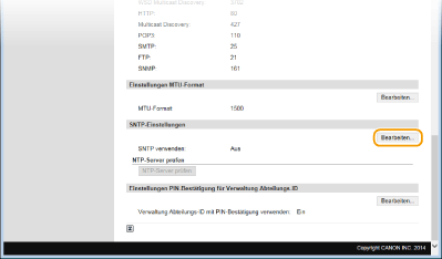 Testen der Kommunikation mit dem NTP-/SNTP-ServerSie können testen, ob das Gerät über SNTP mit dem gespeicherten Zeitserver kommuniziert. Navigieren Sie zu [Einstellungen/Registrierung]