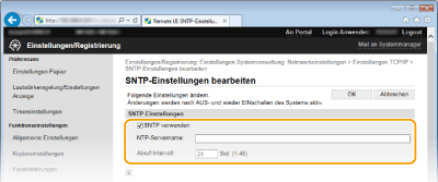 SNTP (Simple Network Time Protocol) ermöglicht die Einstellung der Systemuhr über einen Zeitserver im Netzwerk. Das Protokoll wird üblicherweise zum Synchronisieren des Geräts mit einem Server verwendet, wenn beispielsweise das Gerät auf einen LDAP-Server mit aktivierter Sicherheitsauthentisierung zugreifen muss. Die Uhrzeit wird auf der Grundlage der koordinierten Weltzeit (UTC, Universal Time Coordinated) eingestellt, Sie müssen also die Zeitzone angeben, bevor Sie SNTP konfigurieren (Einstellungen Datum/Zeit). SNTP-Einstellungen können Sie über Remote UI festlegen.