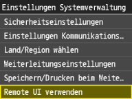 Remote UI ist nützlich, wenn Sie die Geräteeinstellungen über einen Webbrowser auf einem Computer festlegen können. Das Gerät muss mit einem Computer im Netzwerk verbunden sein, damit Sie Remote UI verwenden können. Wenn das Gerät über USB mit einem Computer verbunden ist oder wenn Sie Remote UI nicht benötigen, können Sie Remote UI deaktivieren und so das Risiko verringern, dass ein böswilliger Dritter das Gerät über das Netzwerk fernsteuert.