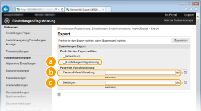 Sie können die Einstellungsdaten der Menüoptionen auf dem Computer speichern oder die gespeicherten Daten beim Gerät registrieren. Die exportierten Daten können importiert werden. Wenn Sie das gleiche Modell verwenden, können andere Geräte die von diesem Gerät exportierten Daten importieren und umgekehrt. Dieser Vorgang kann nur durchgeführt werden, wenn Sie im Systemmanager-Modus angemeldet sind.