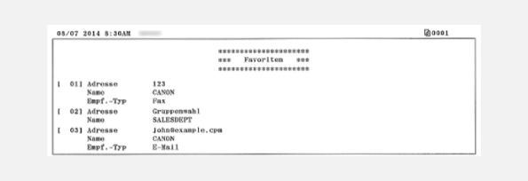 Sie können eine Liste der unter <Kodierte Wahl>, <Favoriten> und <Gruppenwahl> im Adressbuch gespeicherten Empfänger drucken.