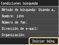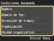 Los nombres personales, los números de fax, las direcciones de e-mail, los nombres de organizaciones y los nombres de departamentos son criterios disponibles para buscar destinos. Es posible especificar varios criterios de búsqueda al mismo tiempo.
