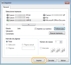 El método para mostrar el cuadro de diálogo de impresión varía según la aplicación. Para obtener más información, consulte el manual de instrucciones de la aplicación que esté utilizando.