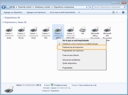Haga clic con el botón derecho del ratón en el icono de impresora y haga clic en [Preferencias de impresión].