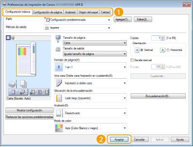 La configuración predeterminada es aquella que aparece por primera vez al abrir la pantalla de opciones de impresión del controlador de impresora, pero puede cambiarla cuando lo desee. Por ejemplo, si desea imprimir todos los documentos, incluidos los documentos en color, en blanco y negro, puede cambiar la opción predeterminada del modo de color a [Blanco y negro]. Si cambia la configuración predeterminada, la opción siempre será [Blanco y negro] al abrir la pantalla del controlador de impresora, y podrá eliminar la necesidad de especificar la misma configuración cada vez que realice impresiones.