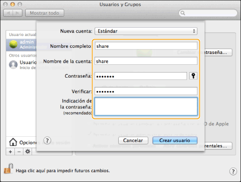 En la ventana [Cuentas]/[Usuarios y Grupos], introduzca el nombre del usuario a quien desea enviar los datos desde el equipo a través de Mac OS X