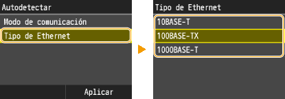 <10BASE-T>, <100BASE-TX> o <1000BASE-T>.![]() ![]() Para especificar <1000BASE-T>, debe seleccionar <Full Duplex> en el paso 2.