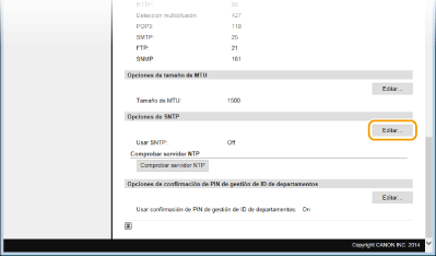 [Opciones de red] [Opciones de TCP/IP] y haga clic en [Comprobar servidor NTP] en [Opciones de SNTP]. Si se ha establecido correctamente una conexión, el resultado se mostrará de la siguiente manera. Tenga en cuenta que esta operación no ajusta el reloj del sistema.![]() |