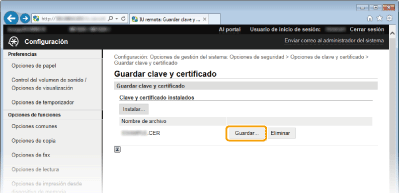 Los pares de claves y los certificados digitales pueden obtenerse con la ayuda de una entidad de certificación (CA) y utilizarse con el equipo. Puede guardar y registrar estos archivos utilizando la IU remota. Asegúrese de que el par de claves y el certificado cumplan los requisitos del equipo (