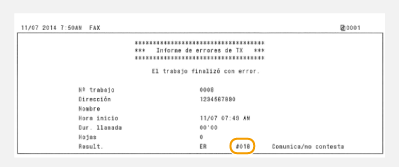 Cuando el equipo del destinatario está apagado o la línea está ocupada, no es posible enviar faxes. Solicite al destinatario que consulte el estado del equipo. Si aparece este código al enviar un fax al extranjero, introduzca pausas en el número de fax.
