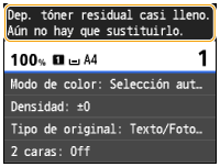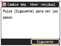 <Casi lleno>: el recipiente de tóner residual está casi lleno. Se recomienda sustituir el recipiente por uno nuevo.