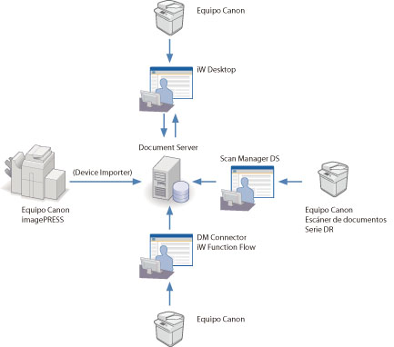 Los documentos importados con iW Scan Manager DS pueden enviarse a "Document Server", que es el producto de software esencial de la Serie iW utilizado en distintas situaciones de la empresa.