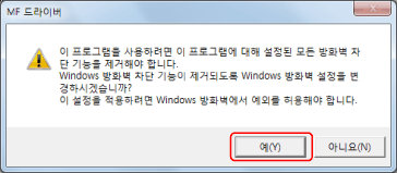 설치 중 다음 대화 상자가 표시되는 경우 [예]를 선택합니다. Windows 방화벽 블록이 제거되고 설치를 진행할 수 있습니다.