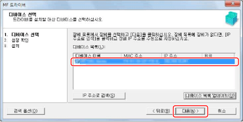 [디바이스 목록]에 디바이스가 표시되지 않는 경우 컴퓨터와 디바이스의 연결 상태 및 IP 주소 설정을 확인하고 [디바이스 목록 업데이트]를 클릭합니다. 여전히 디바이스가 표시되지 않는 경우 [IP 주소로 검색]을 클릭 → 디바이스의 IP 주소 입력 → [확인]을 클릭합니다. IP 주소 확인 방법은 디바이스의 설명서를 참조하십시오.