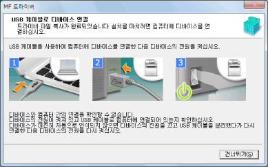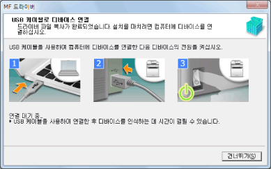 화면의 지침에 따라 USB 케이블을 연결합니다. USB 케이블을 연결하고 설치한 경우 USB 케이블을 분리하고 다시 설치합니다. 또한 이 제품은 USB 케이블이 함께 제공되지 않습니다. 따로 준비하십시오.