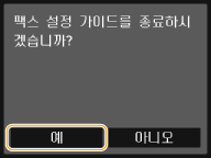 이전에 팩스 설정 화면( 팩스 번호 및 사용자명 등록)에서 <나중에 설정함>을 선택한 경우 <메뉴>  <팩스 설정>  <팩스 설정 가이드>를 터치해서 팩스 설정 화면을 표시합니다. |