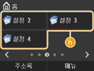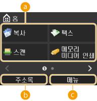 를 누르면 <홈> 화면이 표시됩니다. 기능에 액세스하기 위한 버튼이 홈 화면에 표시됩니다. 홈 화면 버튼을 추가/삭제해서 사용하기 편하게 재배치할 수 있습니다.