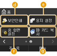 ![]() | <보안인쇄>보안 문서를 인쇄하기 시작할 때에 터치합니다.PIN으로 보호된 문서 인쇄(보안 인쇄) <용지 설정>용지 설정을 지정하기 위한 화면을 표시합니다.용지 넣기 <홈 화면 설정>홈 화면을 맞춤화하기 위한 화면을 표시합니다.홈 화면 맞춤화 <ID 카드 복사>한 장의 용지에서 카드의 앞 뒤를 복사하기 위한 설정을 표시합니다.ID 카드 양면을 한 페이지에 복사 |