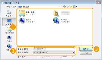 Microsoft Excel과 같은 응용 프로그램에서 작성한 CSV 형식의 주소록 데이터를 기기로 가져오거나 다른 팩스기나 응용 프로그램에서 사용하도록 파일을 내보낼 수 있습니다. 본 기기는 2가지 파일 형식을 지원합니다(CSV 파일(*.csv) 및 Canon 주소록 파일(*.abk)).