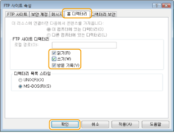 4 | [홈 디렉터리] 탭을 클릭하고, [읽기] 및 [쓰기] 모두를 선택한 후 [확인]을 클릭합니다.![]() |