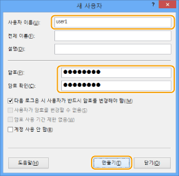 4 | [새 사용자] 대화 상자에서 [사용자 이름]에 사용자 이름을 입력하고 [암호]에 비밀번호를 입력하고 [암호 확인]에 비밀번호를 재입력하고 [만들기]를 클릭합니다.![]() 알파벳 영숫자 20자 미만으로 사용자명을 입력하고, 알파벳 영숫자 32자 미만으로 비밀번호를 설정합니다. [다음 로그온 시 사용자가 반드시 암호를 변경해야 함]을 선택한 경우에는 추가된 신규 사용자는 기기로부터 데이터를 송신하기 위해서 비밀번호를 변경해야만 합니다.(제어판에서 비밀번호를 변경할 수는 없습니다.) ![]() Active Directory 환경에서는 사용자를 설정하기 위한 절차는 위와 다릅니다. 자세한 정보는Windows설명서를 참조하십시오. |