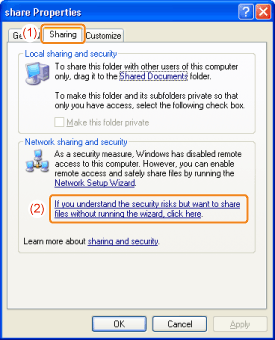 Click [If you understand the security risks but want to share files without running the wizard, click here].