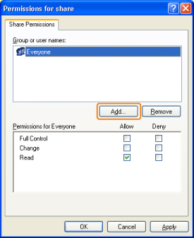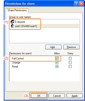 Select the check box for [Full Control] here so that data scanned by the printer can be saved to the computer (file server).