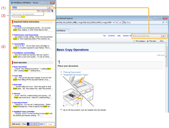 Enter a keyword in the keyword/text field located on the upper right hand corner of the "Top" or "Topic page", and click [ You can also enter your query in the search box. Additionally, more than one keyword can be entered by adding space in between. Example: "Toner Message" (to display pages which include words, "Toner" and "Message") |
