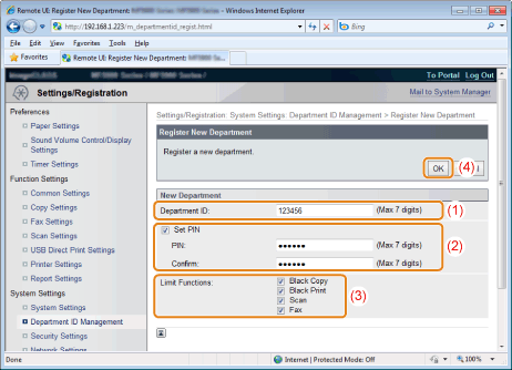 ![]() A department where the feature is not restricted can select <Yes> and then enter its department ID and PIN to use this product.