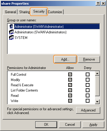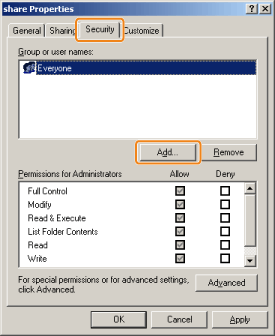 This section explains how to grant "full control" permissions to the "Everyone" user account so that anyone can access the shared folder.