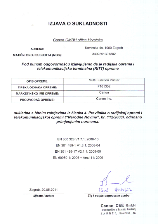 Družba CANON INC. izjavlja, da je tiskalnik FM48944 skladni z bistvenimi zahtevami in ostalimi relevantnimi določili direktive 1999/5/ES.