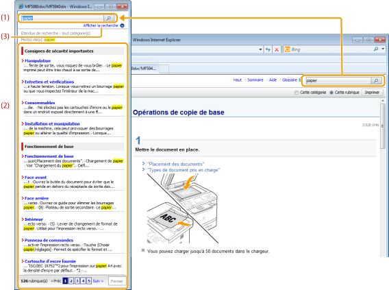 Entrez un mot clé dans le champ prévu à cet effet, dans l'angle supérieur droit de la "page d'accueil" ou de la "page de rubrique", puis cliquez sur [ Vous pouvez également saisir votre demande dans la zone de recherche. Il est aussi possible d'entrer plusieurs mots clés en les séparant par un espace. Exemple : "message encre" (pour rechercher les pages contenant les deux mots "encre" et "message"). |
