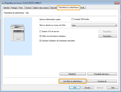Si l'imprimante et l'ordinateur sont connectés via un port USB ou WSD (Web Services on Devices, services Web sur périphériques), la fonction [Lire l'état du périphérique] n'est pas disponible. Il est nécessaire de configurer les paramètres manuellement.