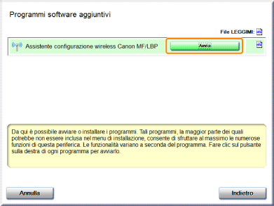 Fare clic su [Avvia] per [Assistente configurazione wireless Canon MF/LBP].