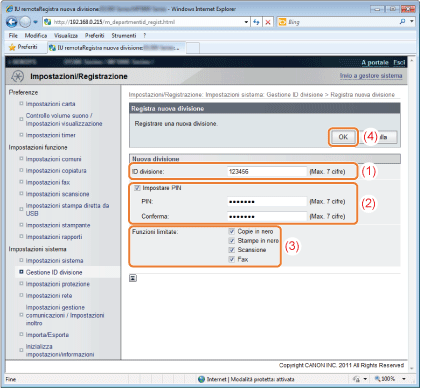 ![]() Una divisione per la quale la funzionalità non è stata ristretta può selezionare <Sì> e immettere il proprio ID e il proprio PIN per poterla utilizzare.