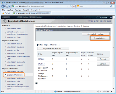 Fare clic su [Gestione ID divisione] -> [Impostazioni].