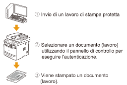 Quando il lavoro del documento di stampa protetta è salvato sul dispositivoSe il documento di stampa protetta è salvato sul dispositivo, è possibile che altri lavori di stampa non vengano stampati. In questo caso, stampare il lavoro di stampa protetta. Se ancora non è possibile stampare il lavoro, effettuare la stampa operando dal computer.